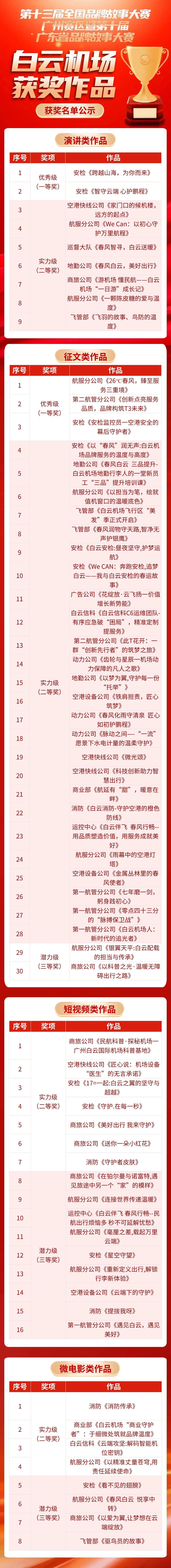 2025年7月30日,第十三届全国品牌故事大赛广州赛区暨第十届广东省品牌故事大赛结果公布,白云机场《跨越山海,为你而来》等5个品牌故事斩获优秀级(一等奖)奖项,并成功摘得演讲类作品仅有的2个直通全国赛名额。