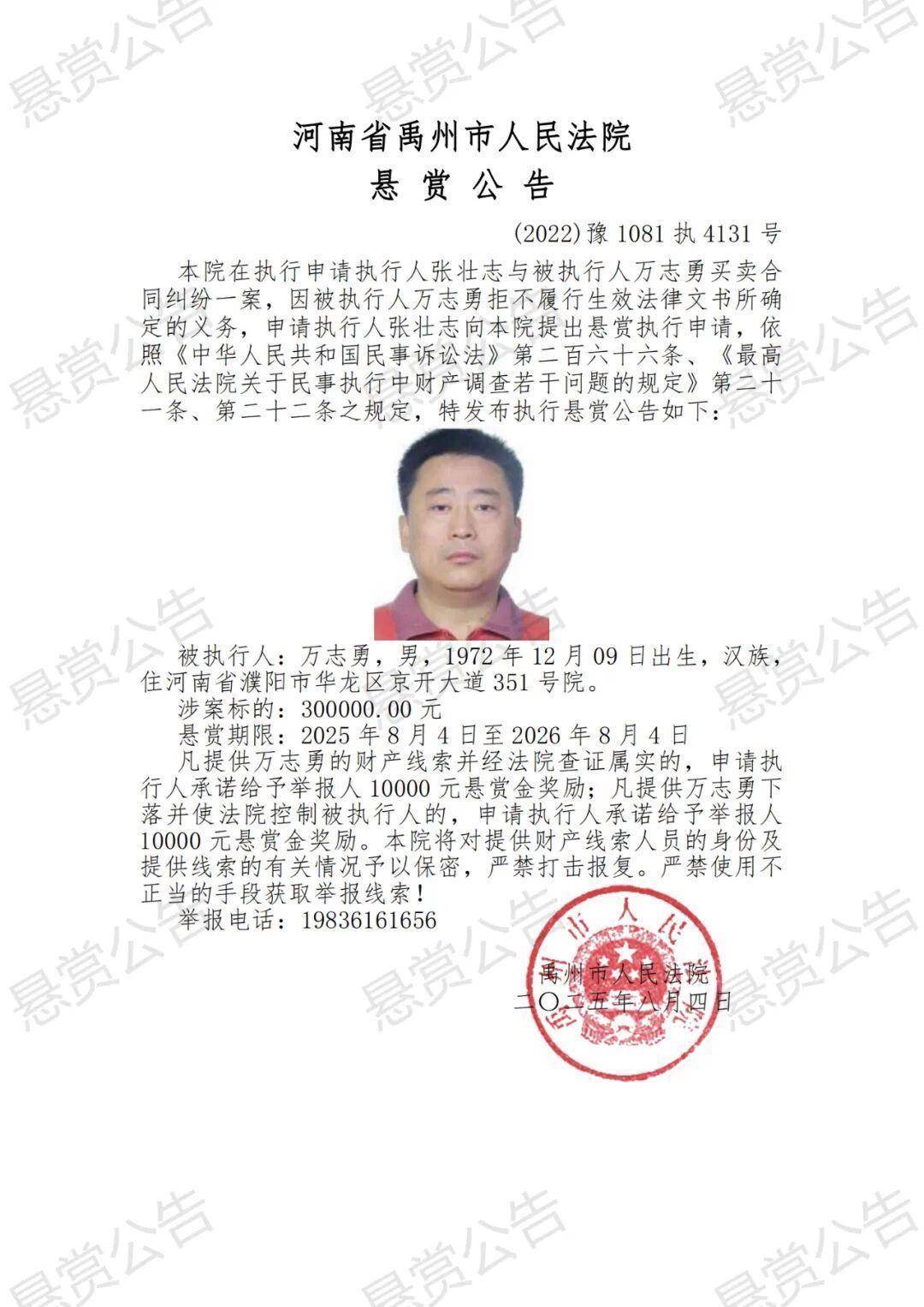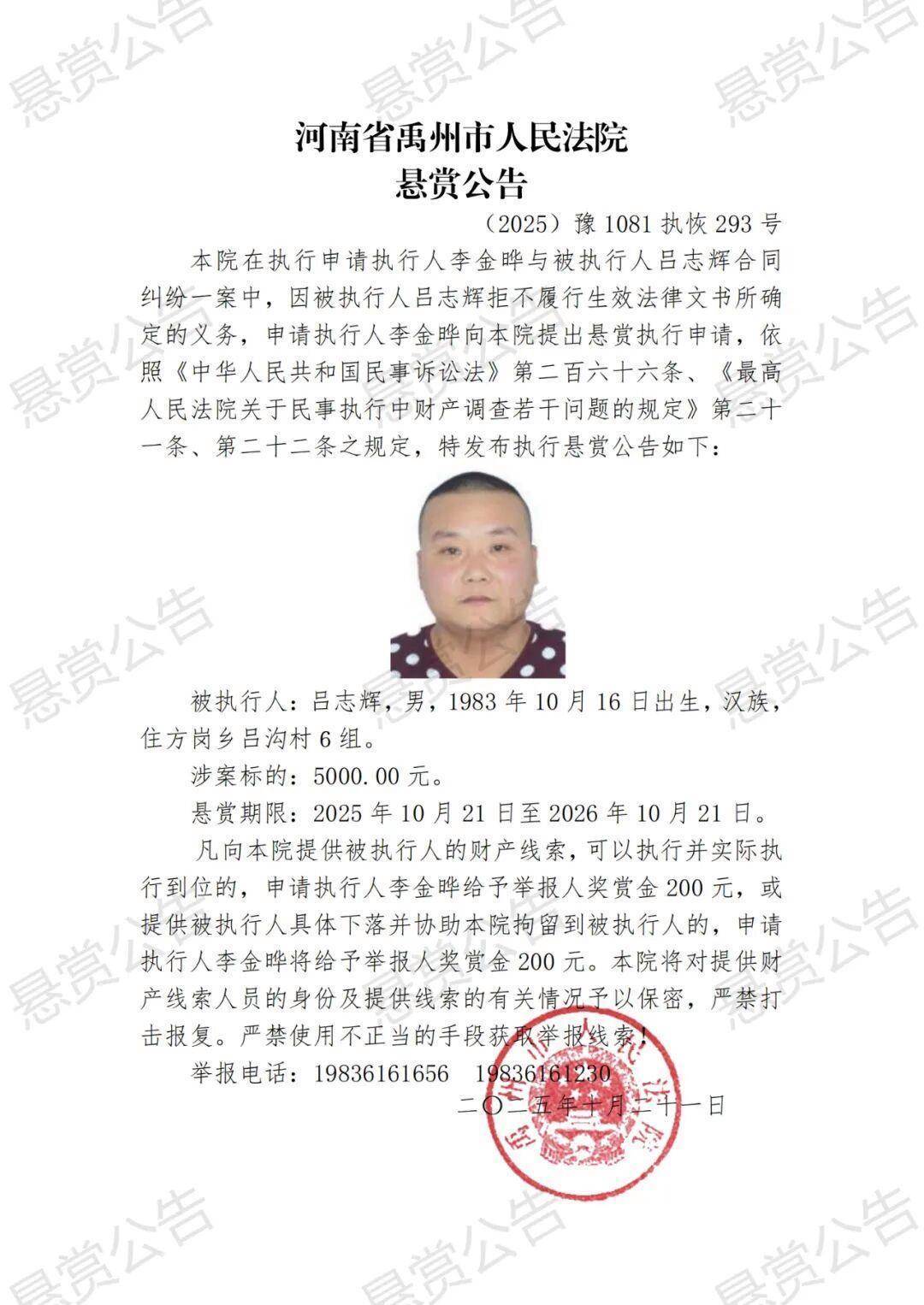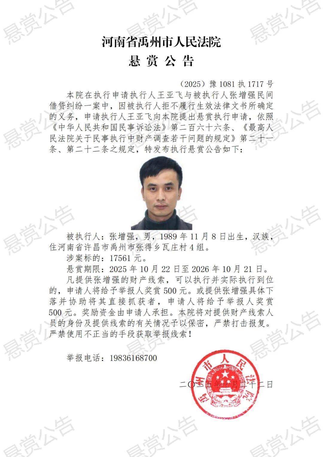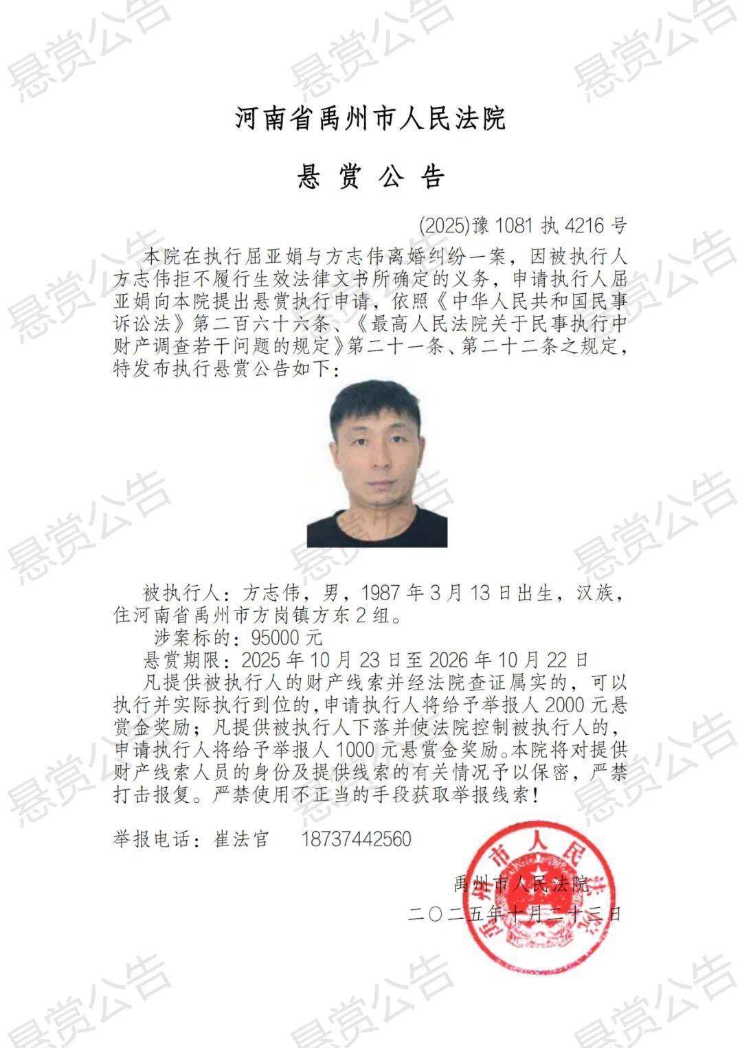 10月27日百事达配资,河南禹州市人民法院发布悬赏公告。