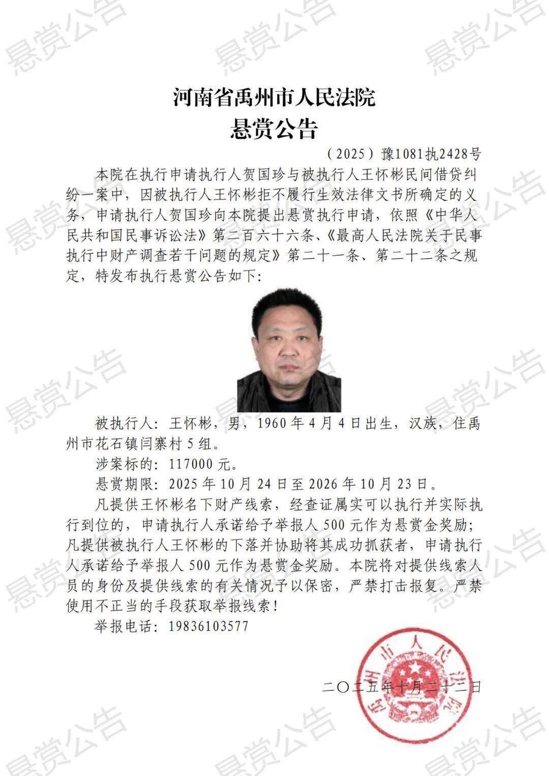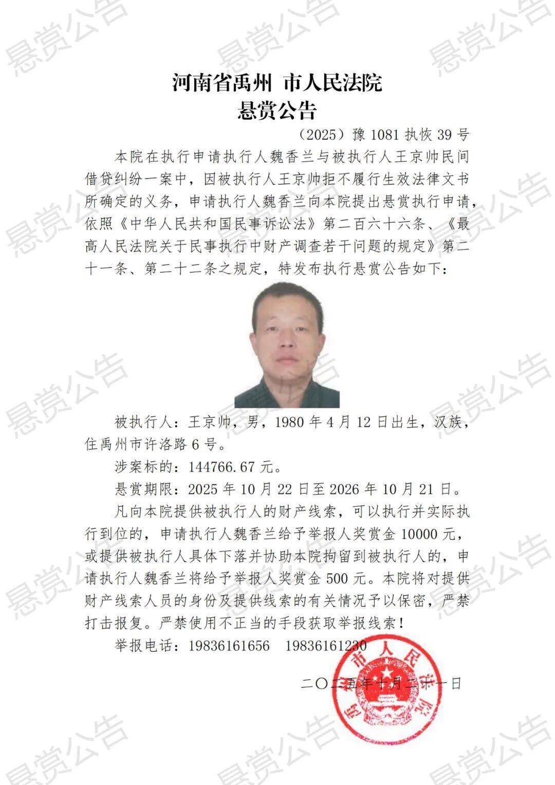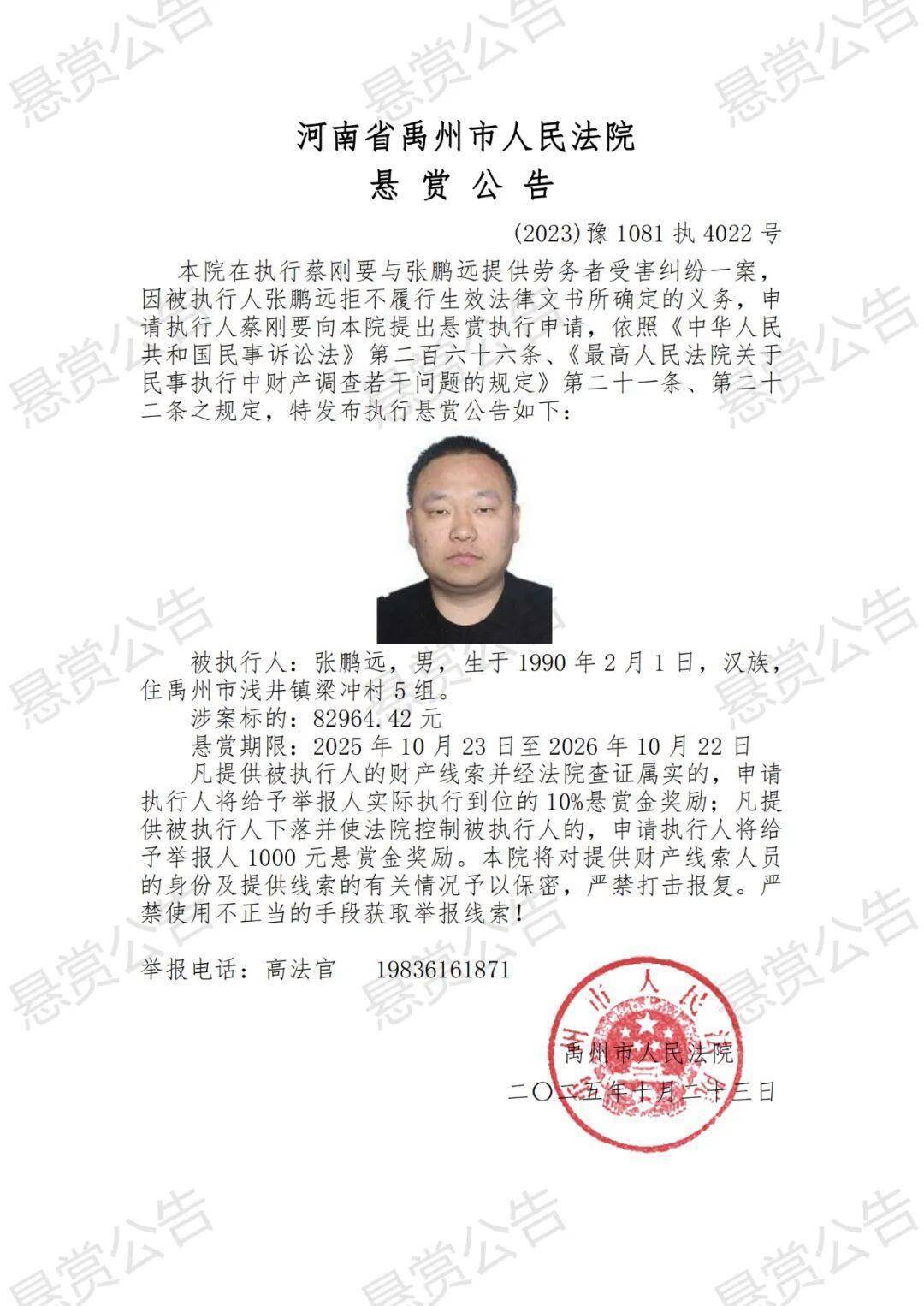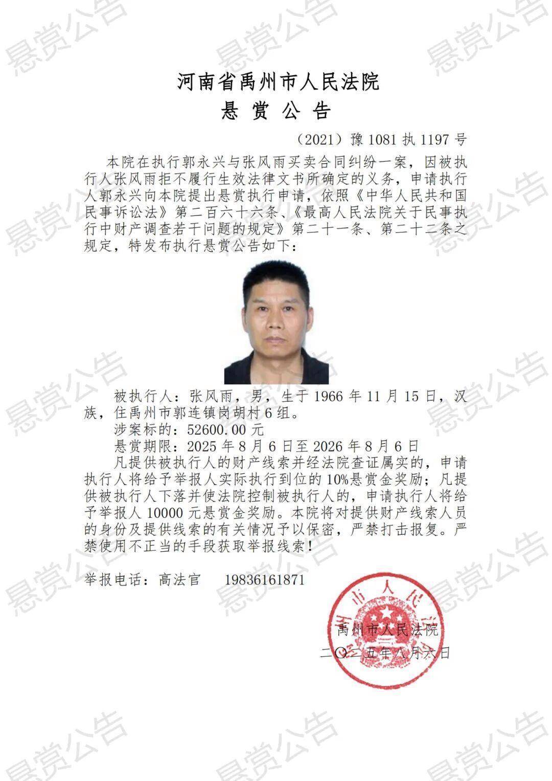 10月27日百事达配资,河南禹州市人民法院发布悬赏公告。