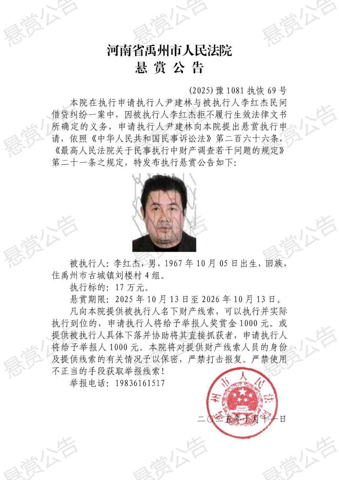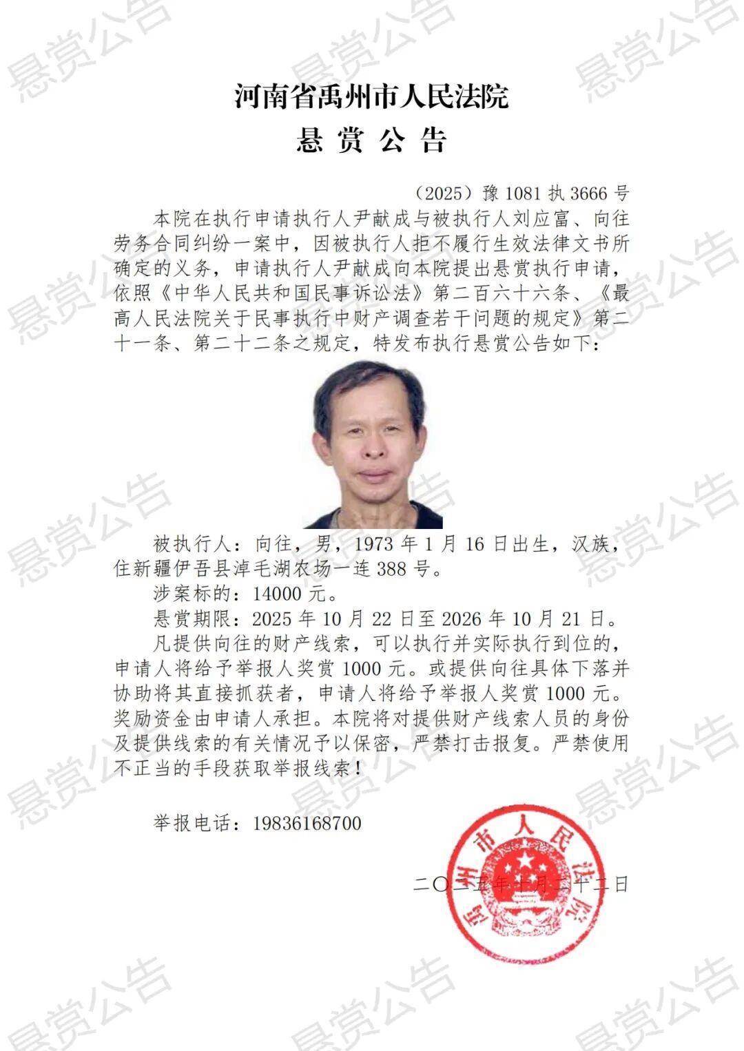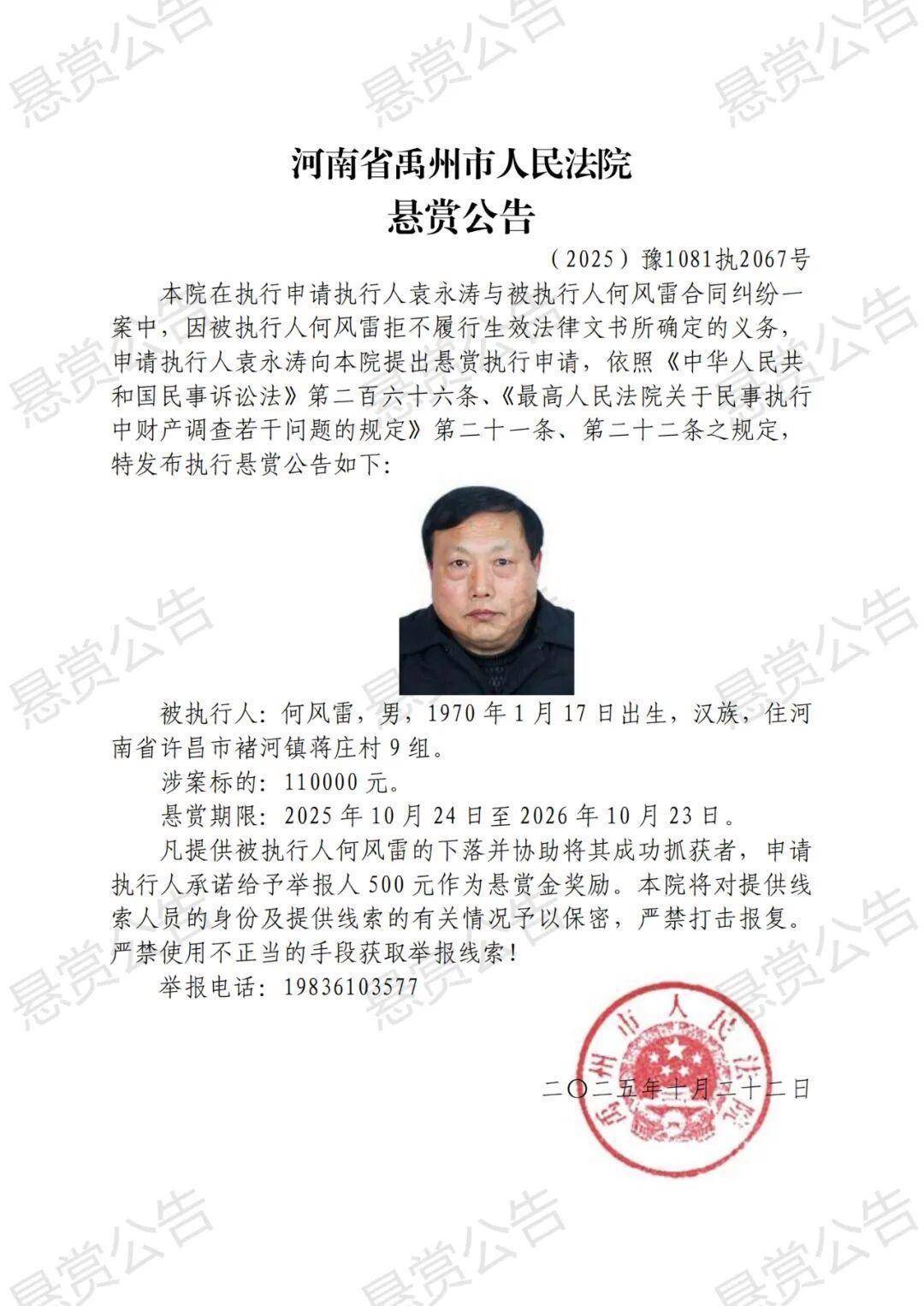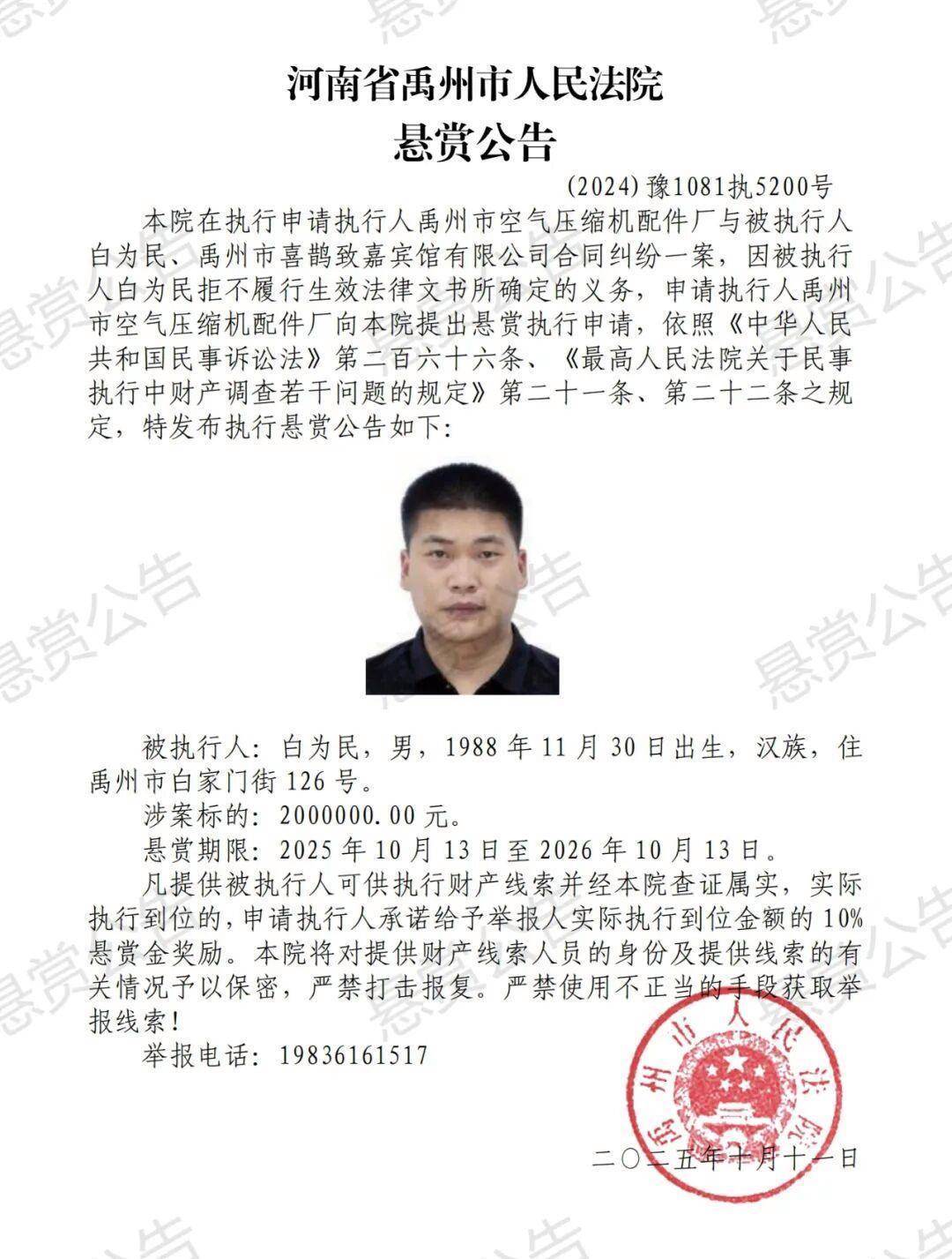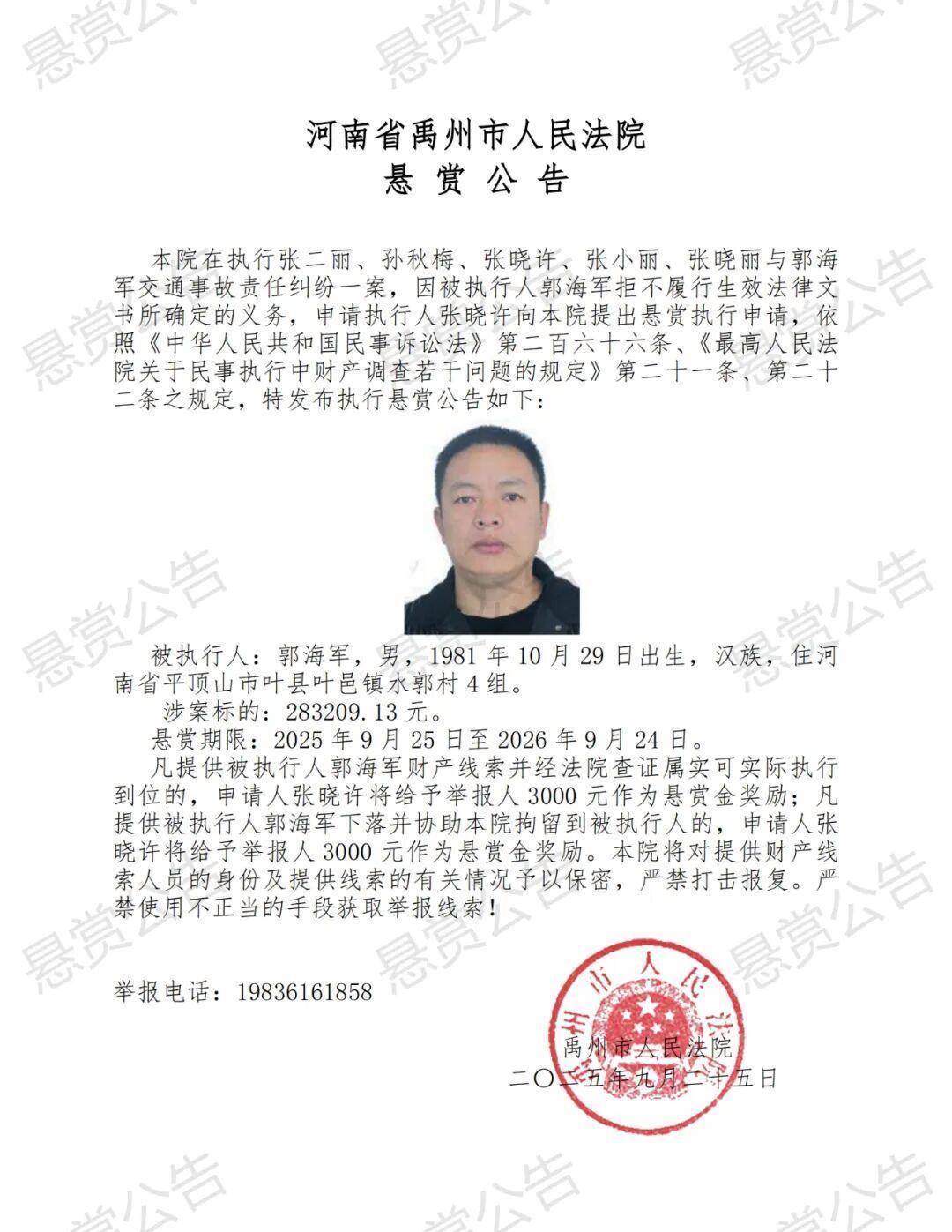 10月27日百事达配资,河南禹州市人民法院发布悬赏公告。