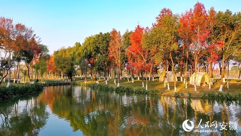 晌午,初冬的暖阳下,大阳垾公园层林尽染,缤纷的倒影在水面闪耀,吸引市民及游客驻足观赏。